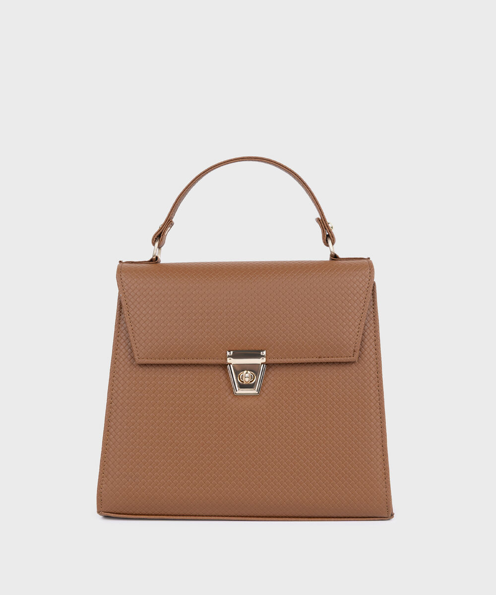 Perfect your style with our textured tan top handle bag with a tuck lock closure.