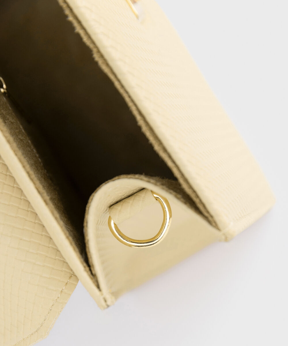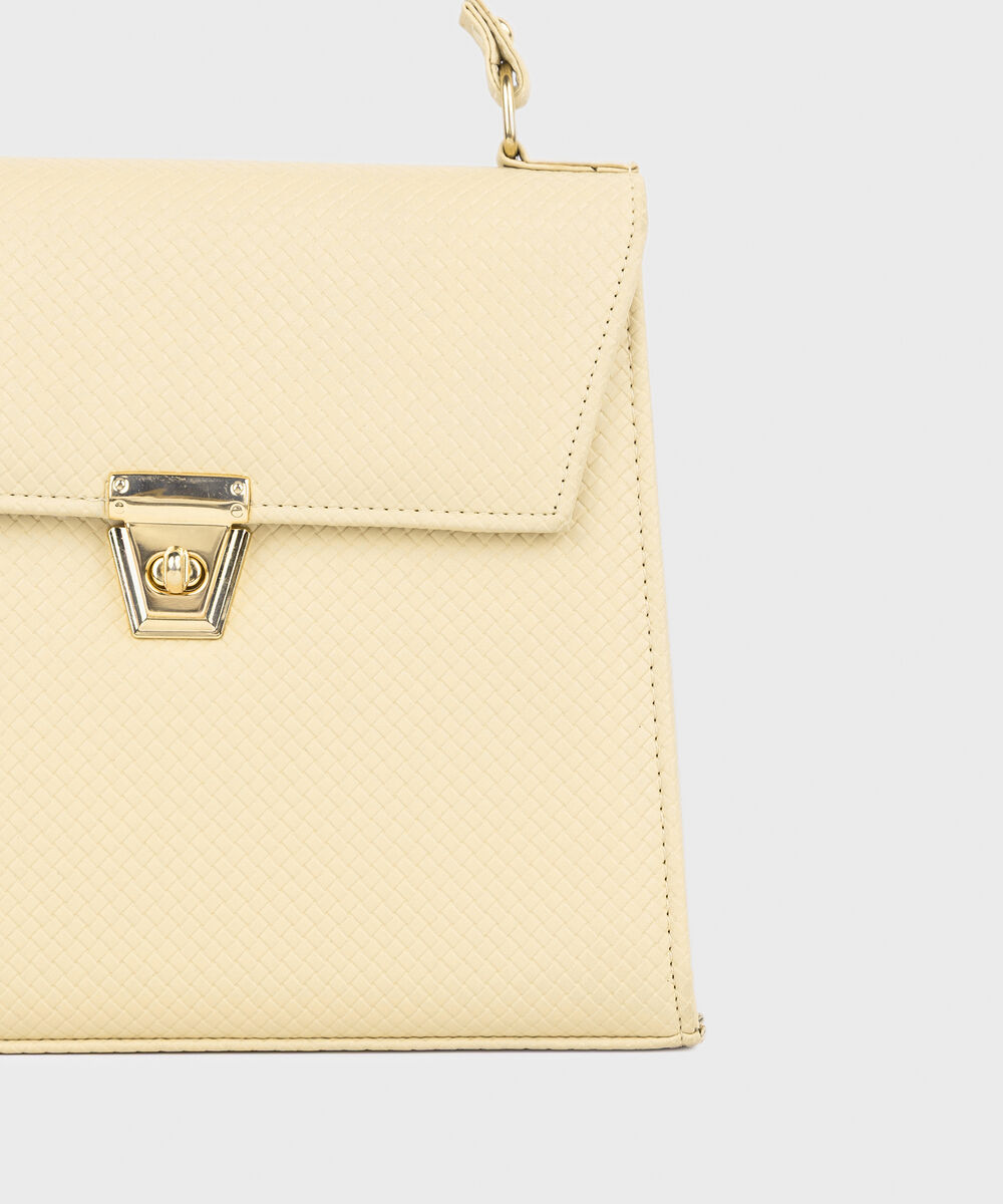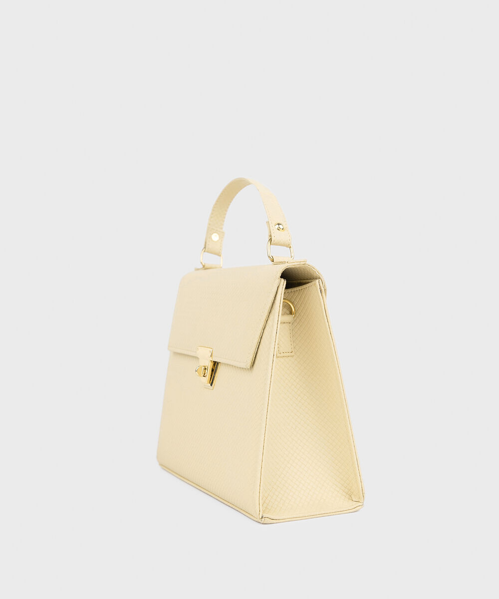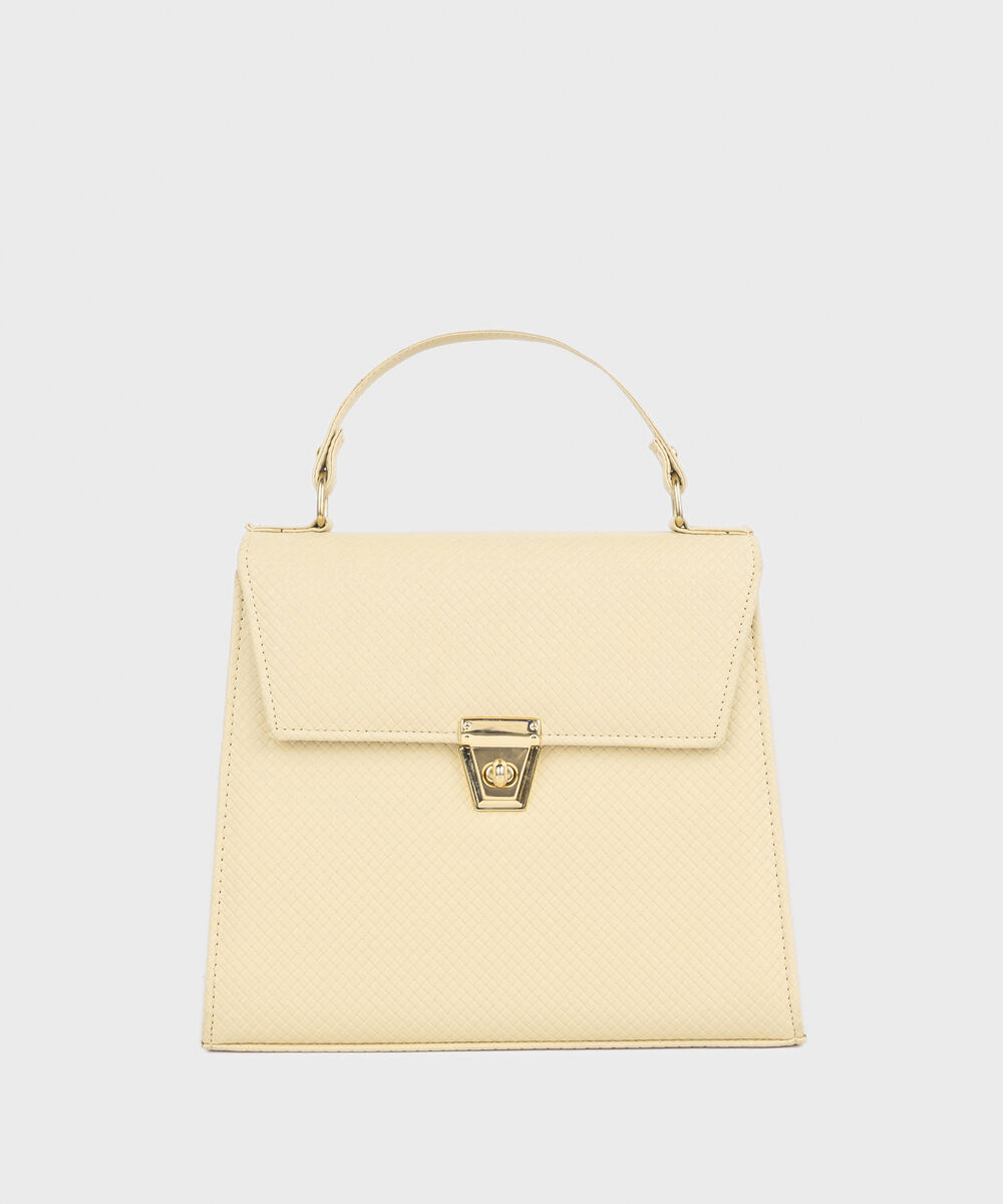 Perfect your style with our textured off-white top handle bag with a tuck lock closure.