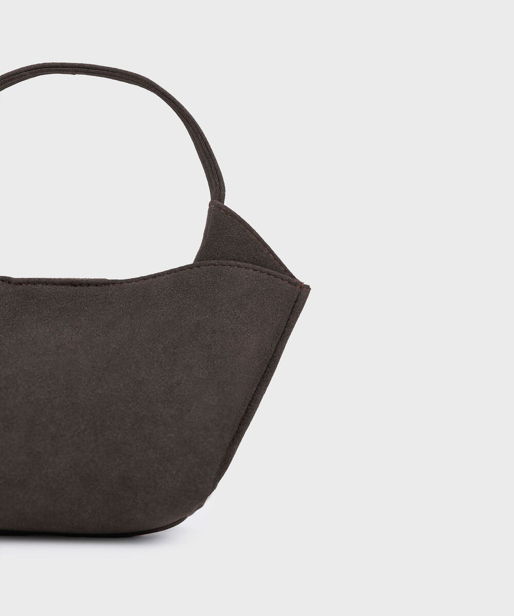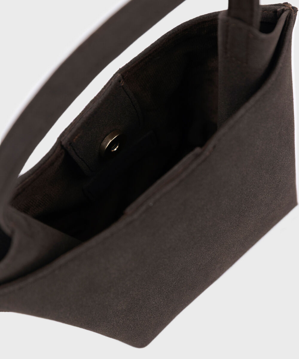 Refresh your style with our brown mini bag with inverted side gazettes and a magnetic snap closure.