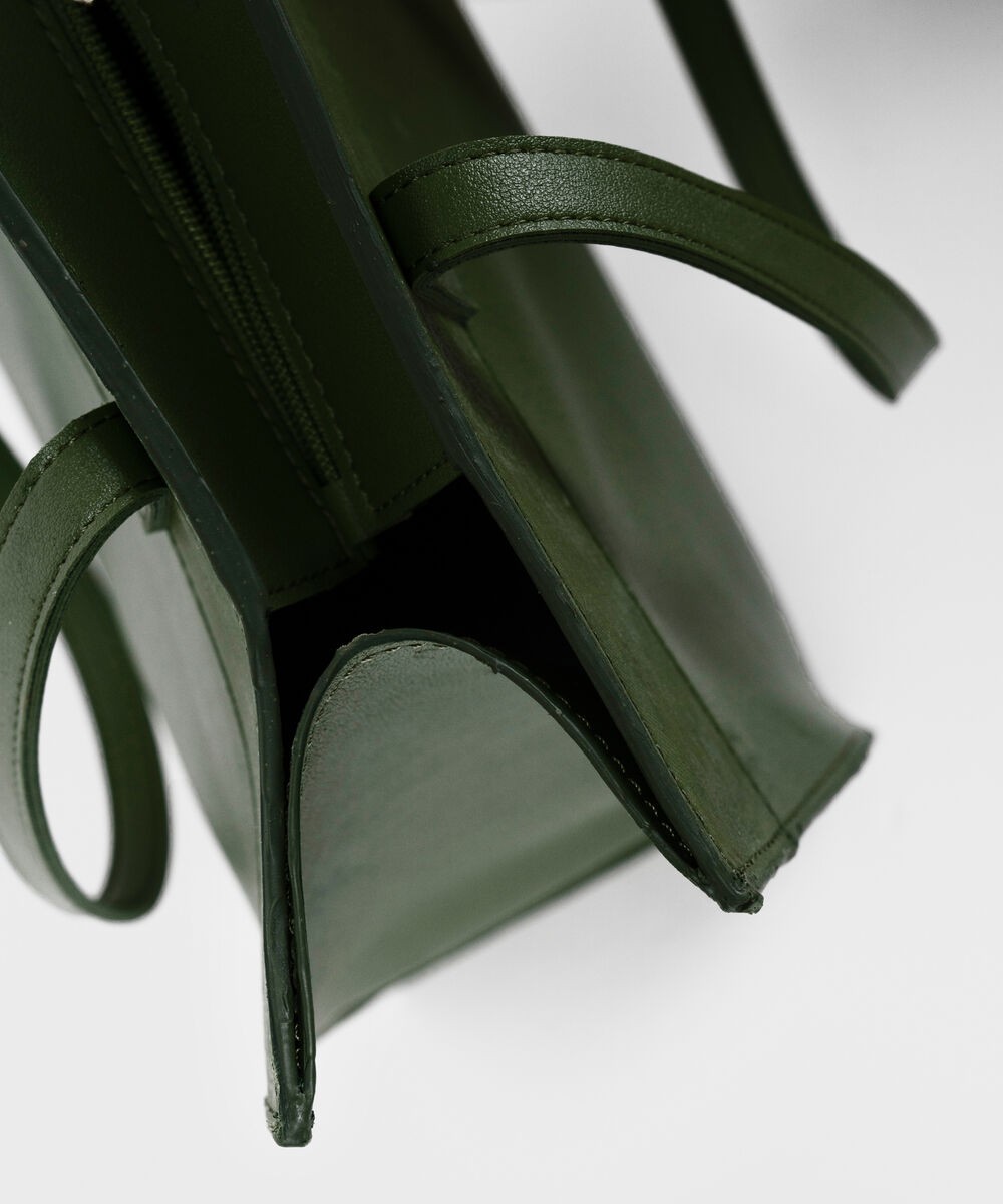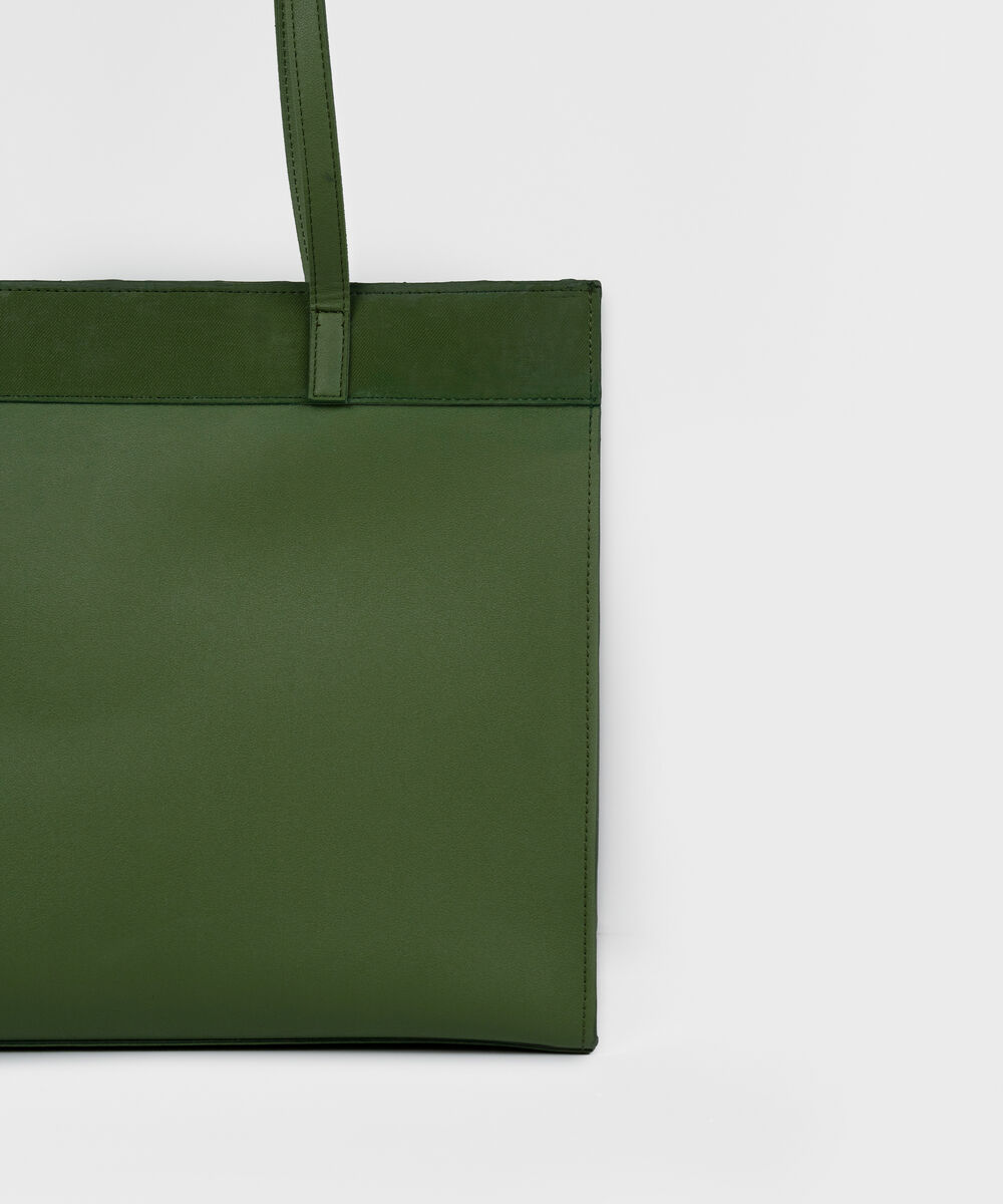 Elevate your everyday look with our green tote bag, featuring a mix of textured panels and a secure zip-top closure.