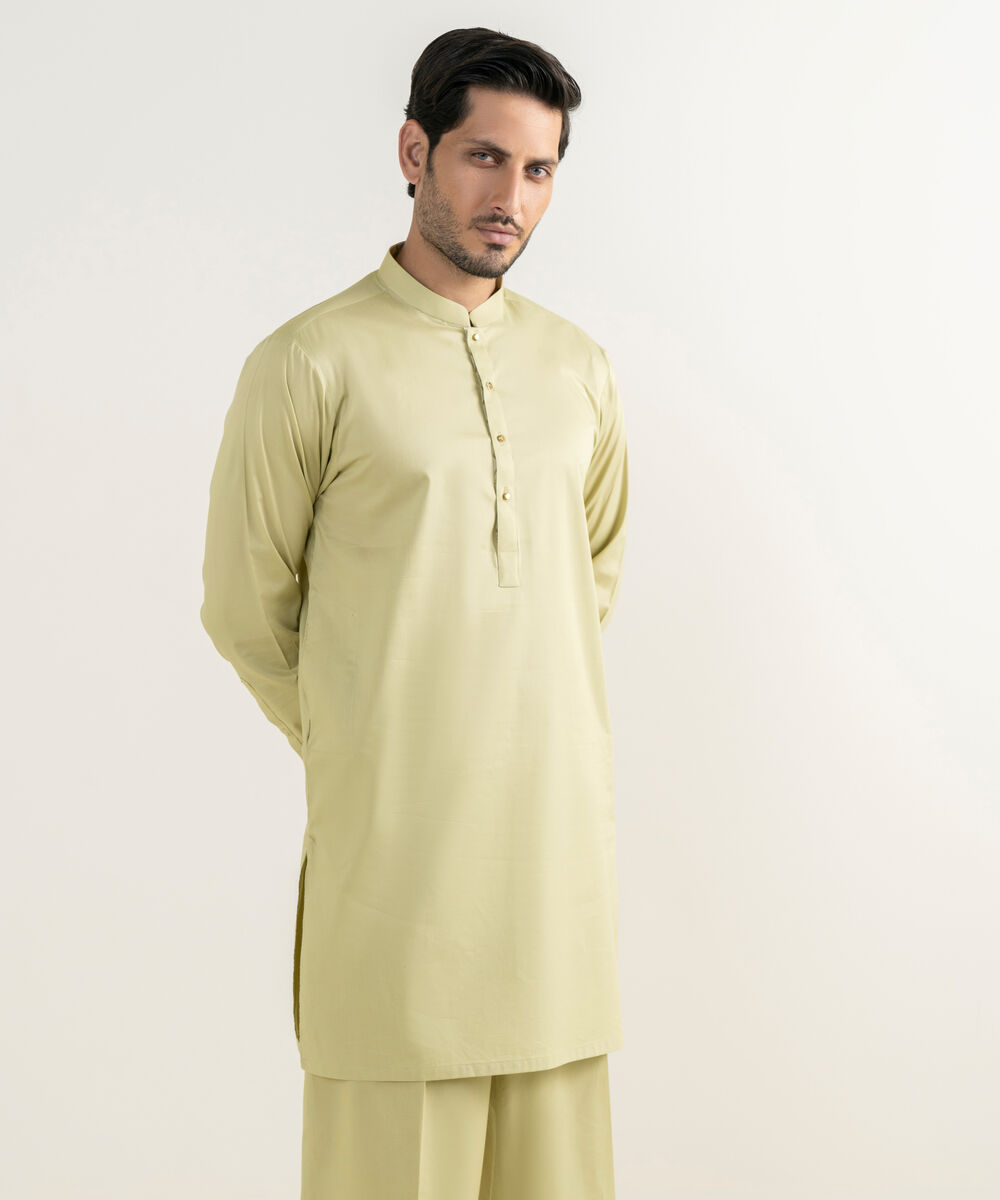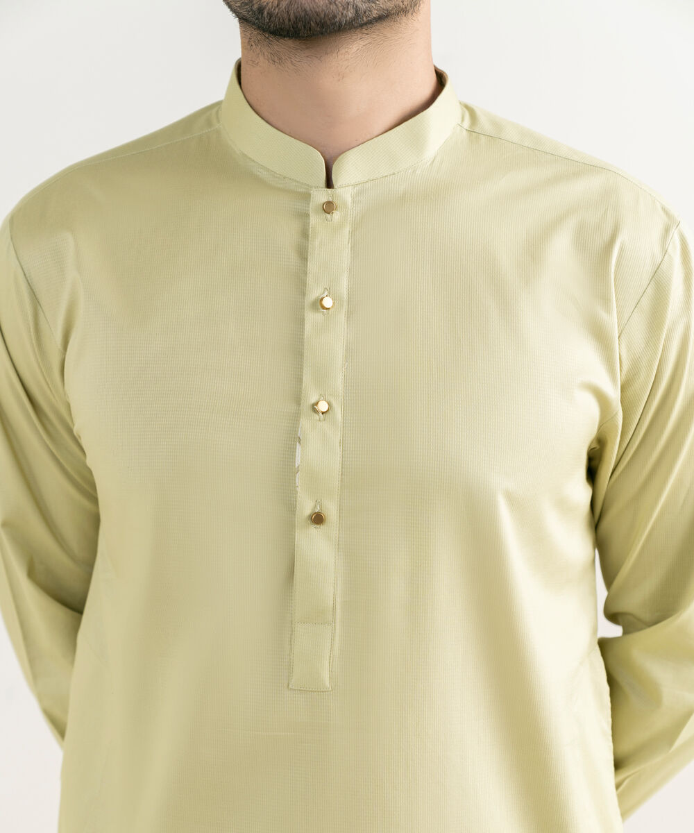 Solid Plain Front, Solid Plain Back, Band Neckline, Standard Placket, Cuff SleevesColour: Light KhakiFabric: Cotton