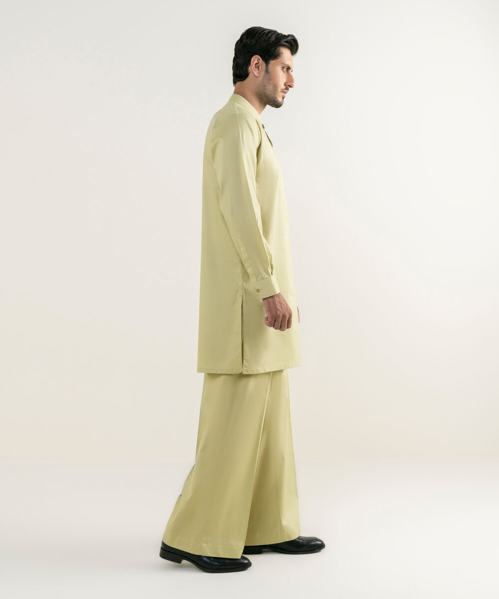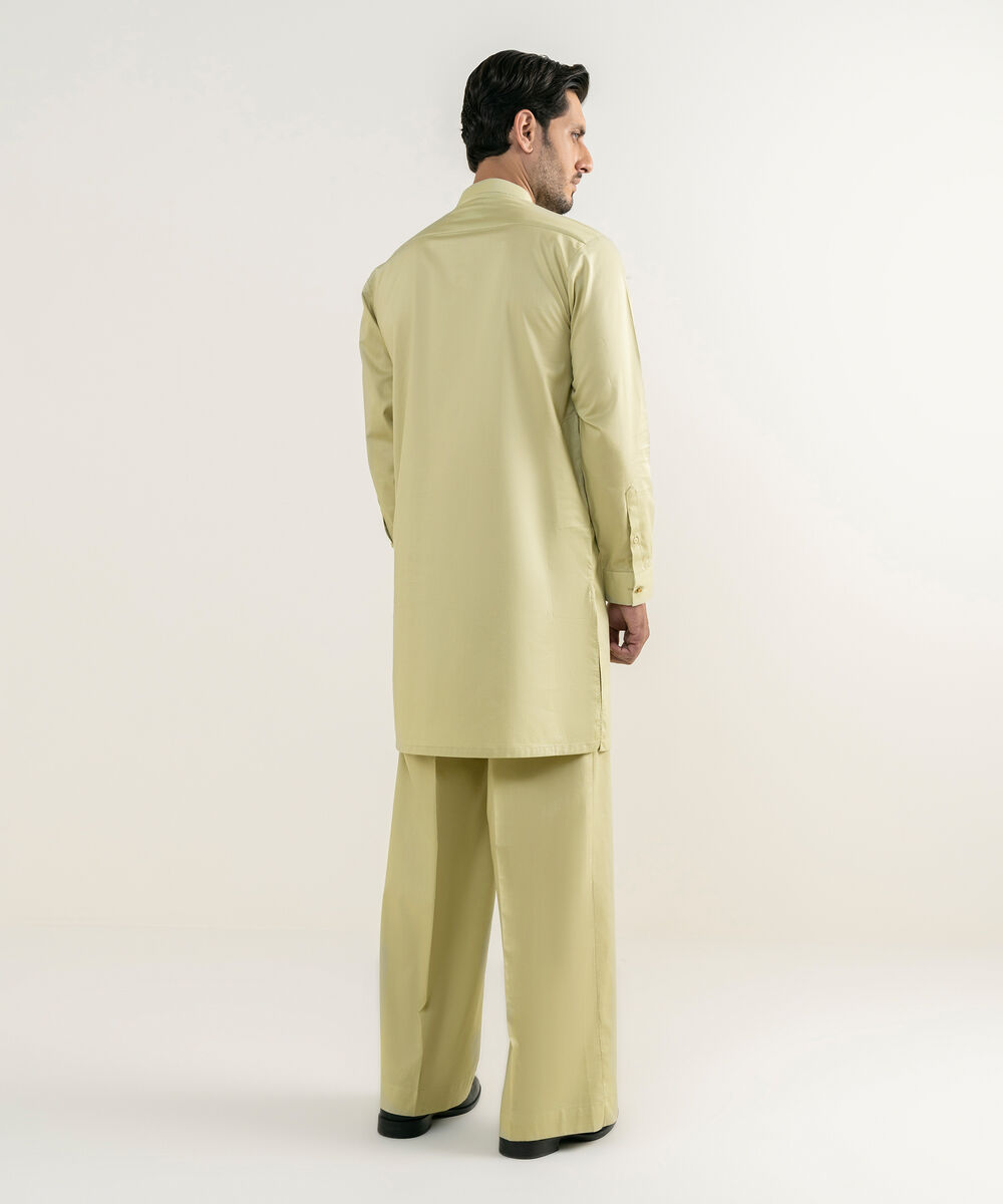 Make a dapper statement with our dyed light khaki kurta and trousers.