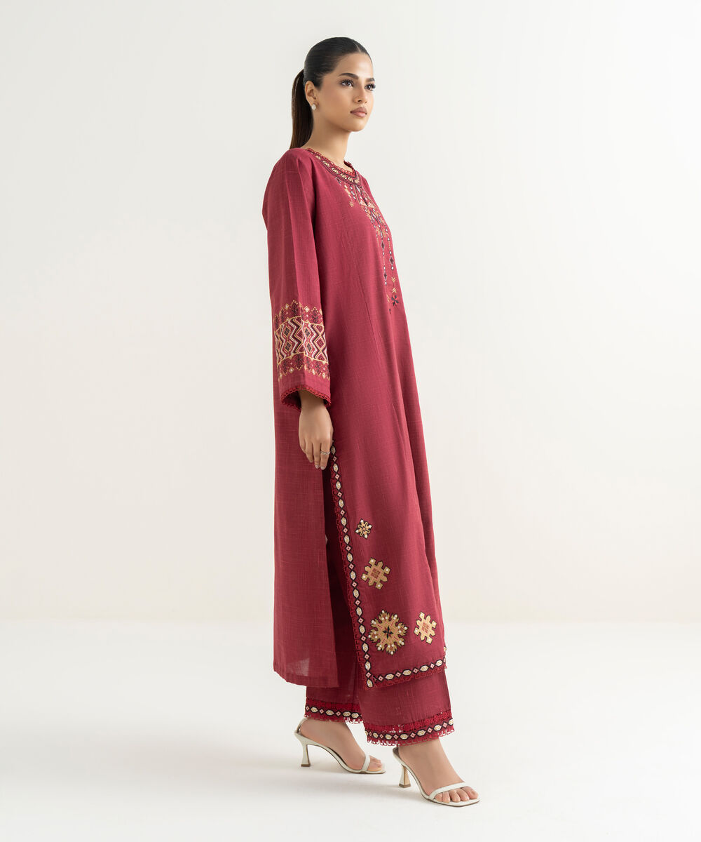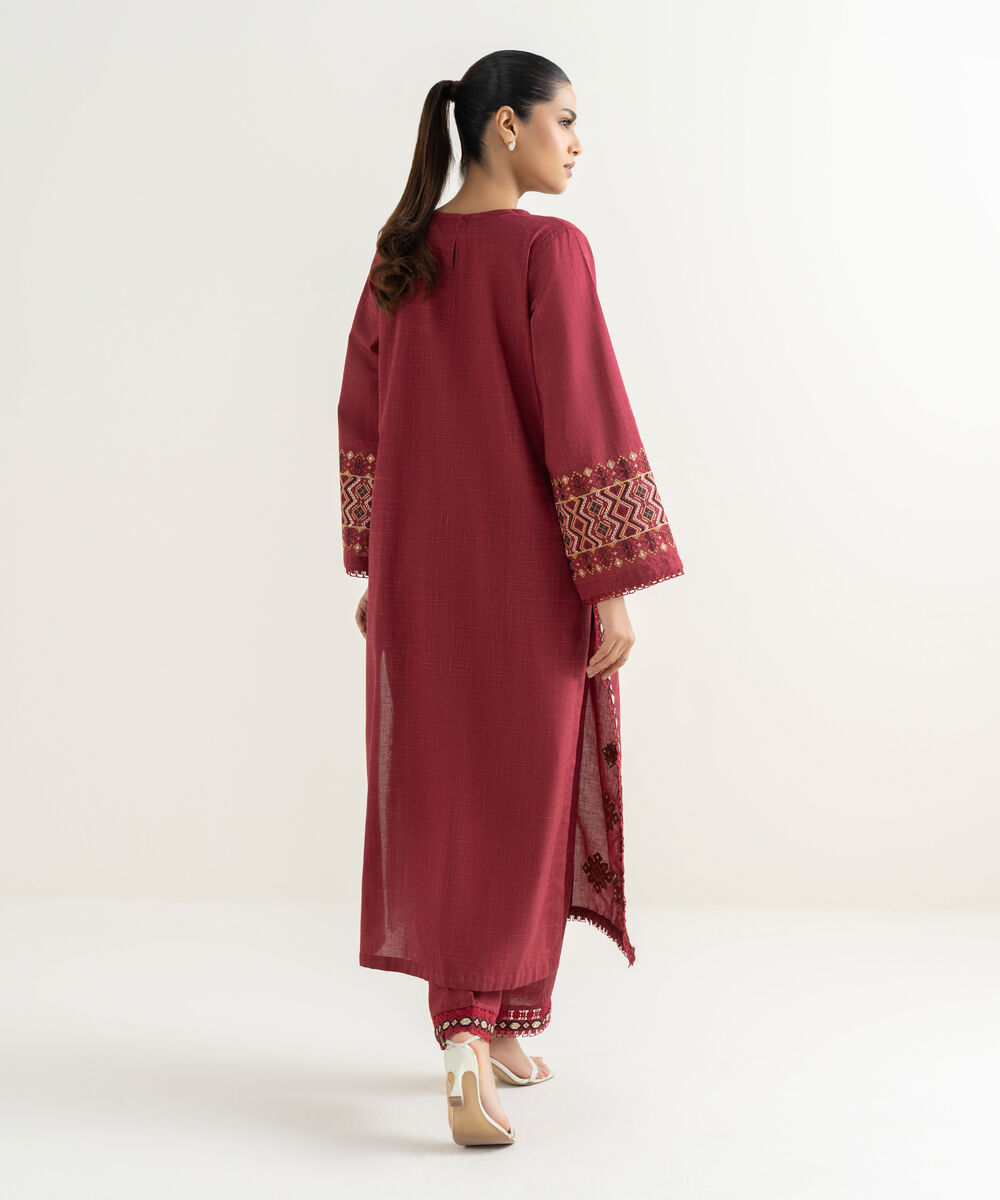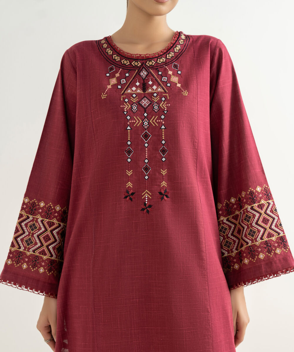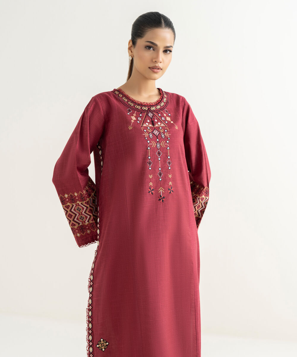 Fit: Regular Dyed With Embroidered Front Panel, Dyed Back Panel, Round Neckline, Full Sleeves, Long LengthColour: PinkFabric: Fancy Cotton