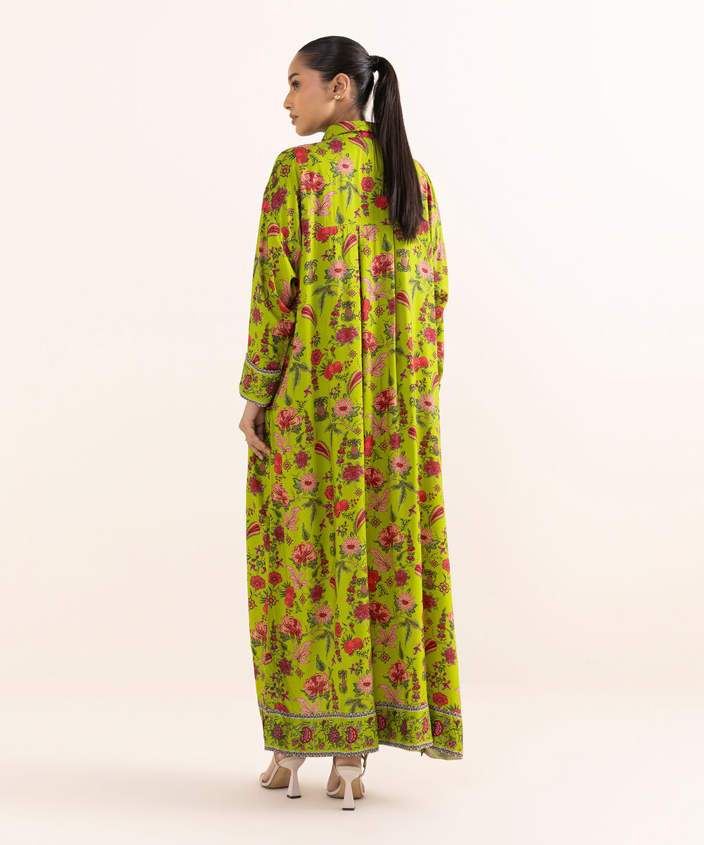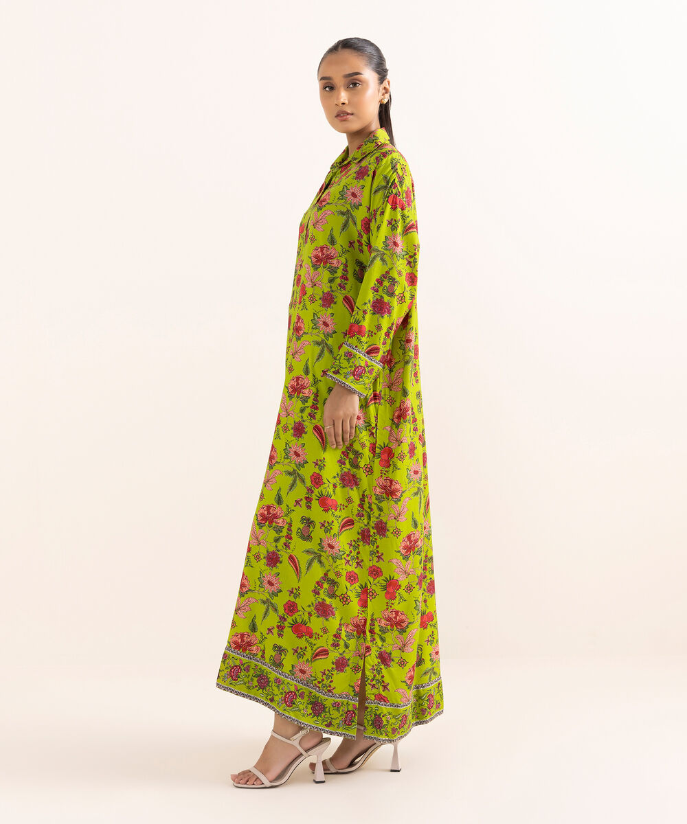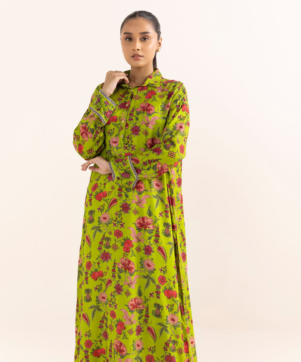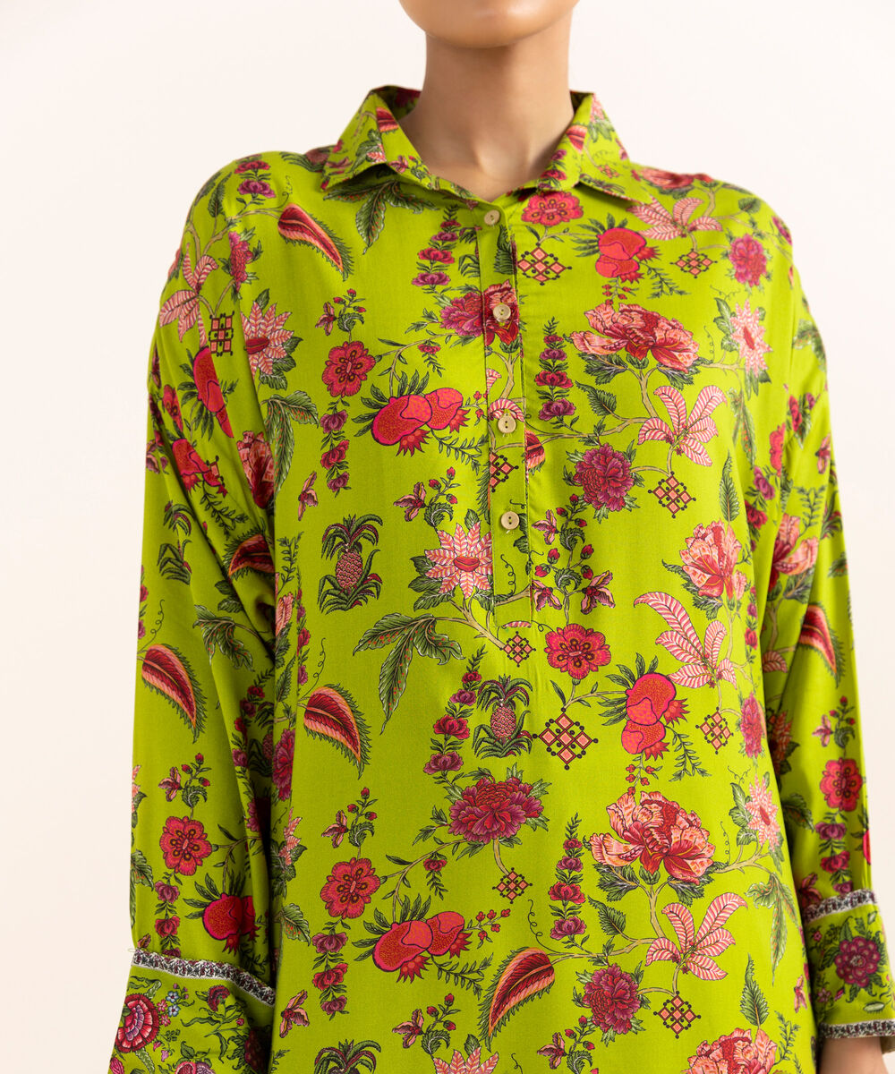 Upgrade your style in our printed green arabic lawn boxy shirt featuring a collared neckline with placket.