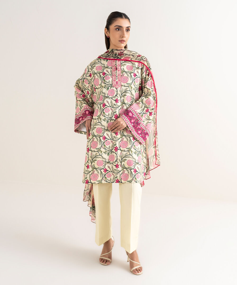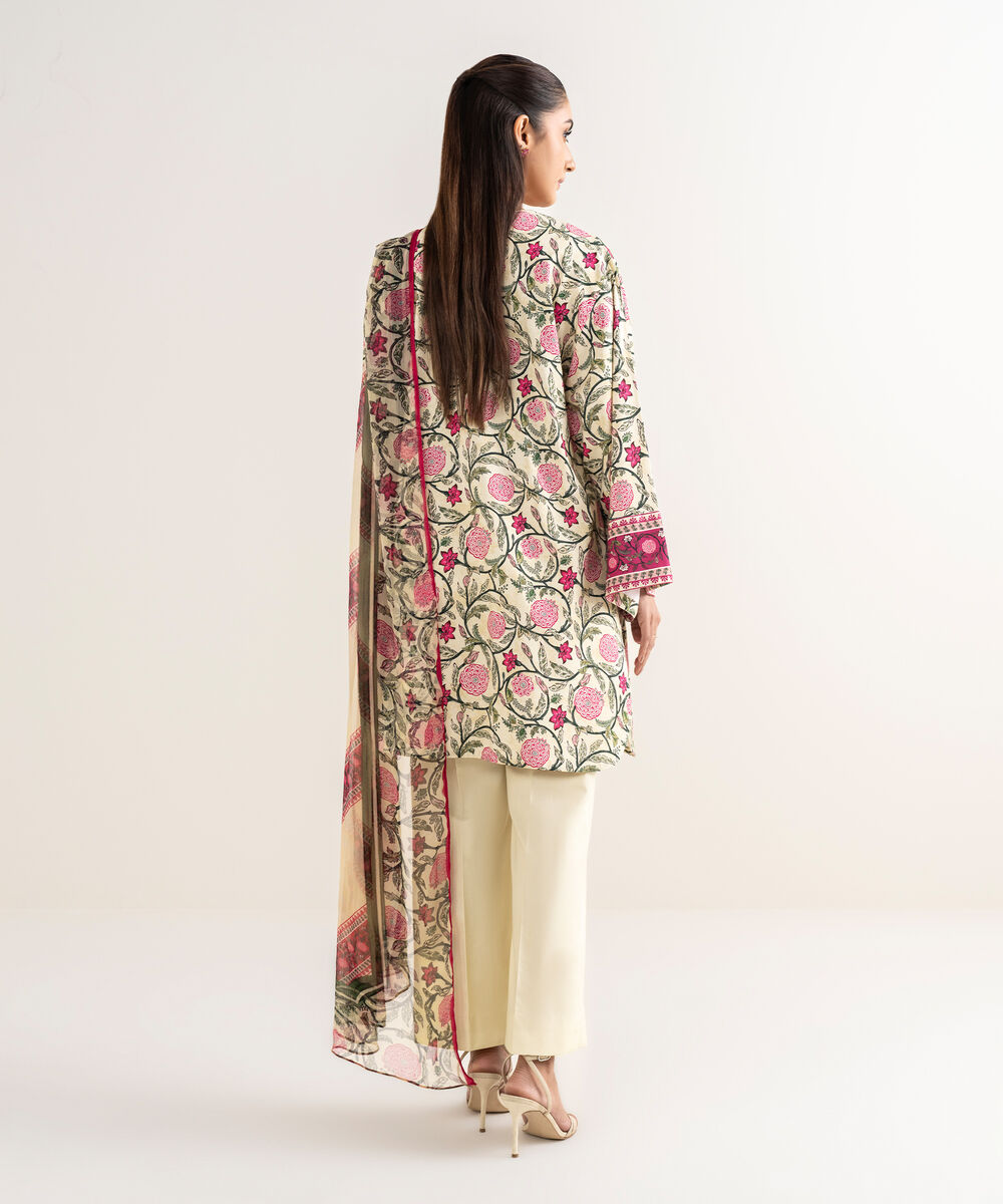 Make a statement with our three-piece embroidered multicoloured ensemble featuring a lawn shirt paired with a blended chiffon dupatta and cotton trousers.