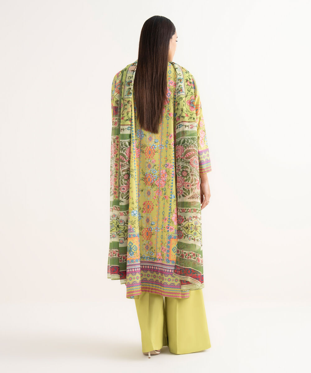 Make a statement with our three-piece printed light green ensemble featuring a lawn shirt paired with a blended chiffon dupatta and cotton trousers.