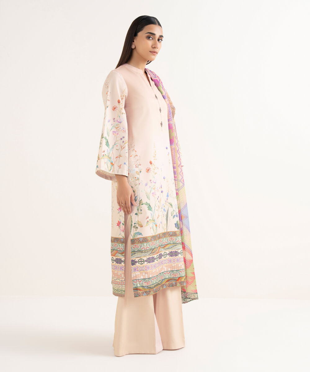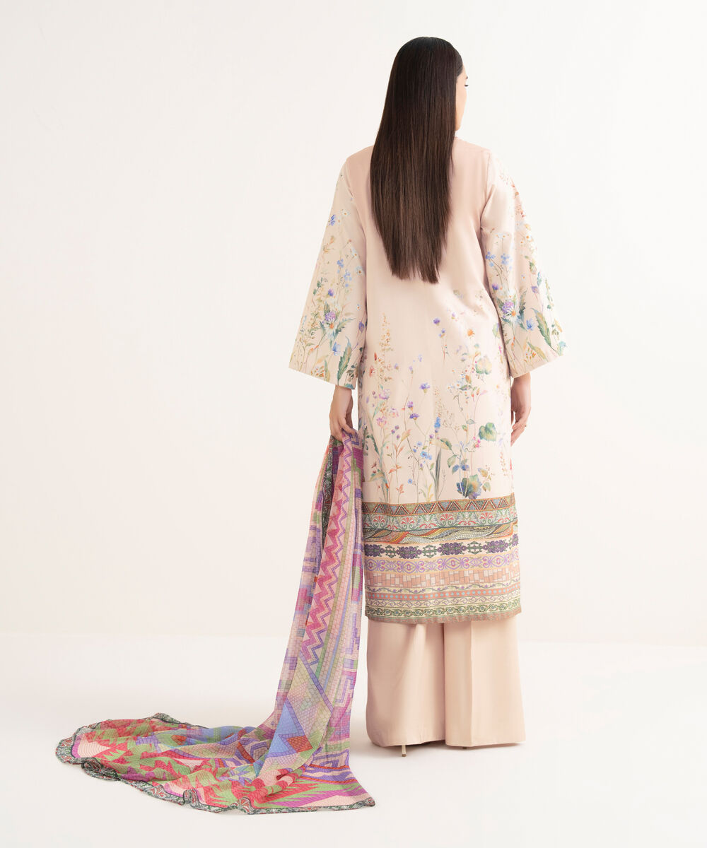 Make a statement with our three-piece printed pastel pink ensemble featuring a lawn shirt paired with a blended chiffon dupatta and cotton trousers.