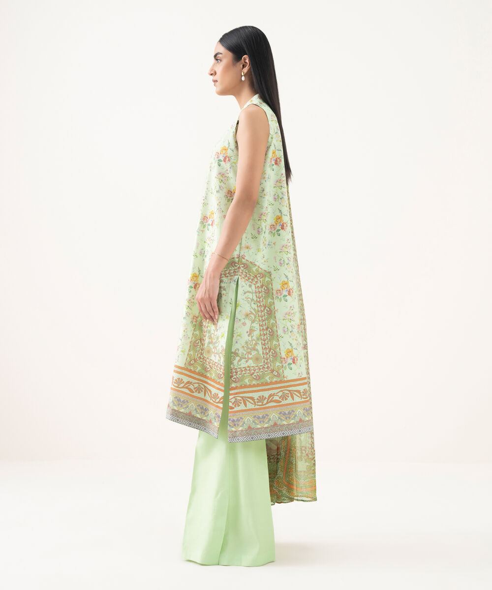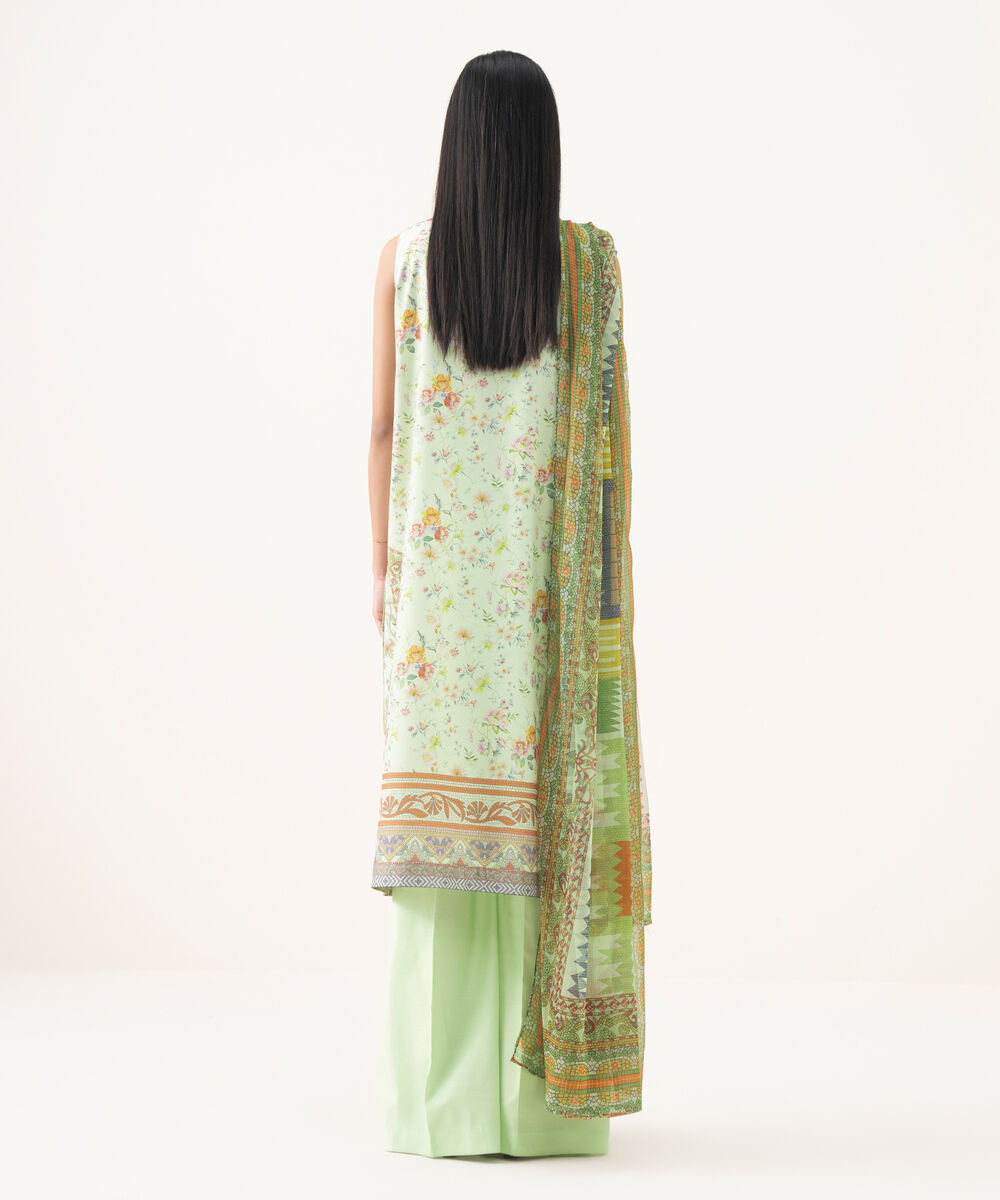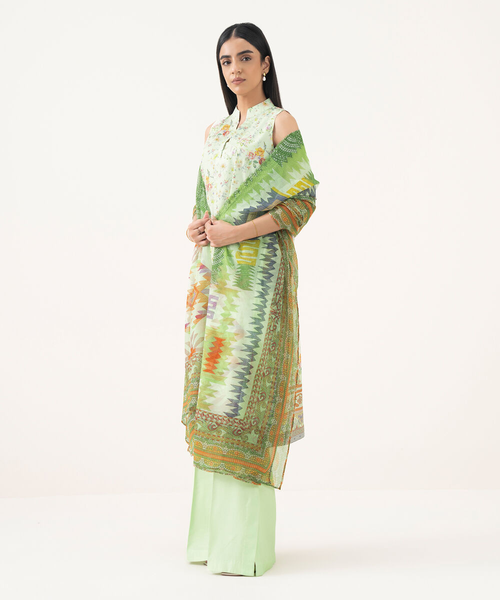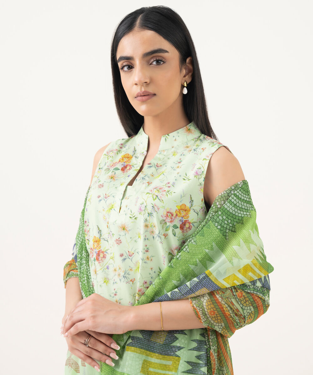 Make a statement with our three-piece printed pastel green ensemble featuring a lawn shirt paired with a blended chiffon dupatta and cotton trousers.