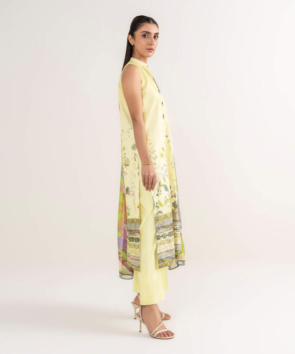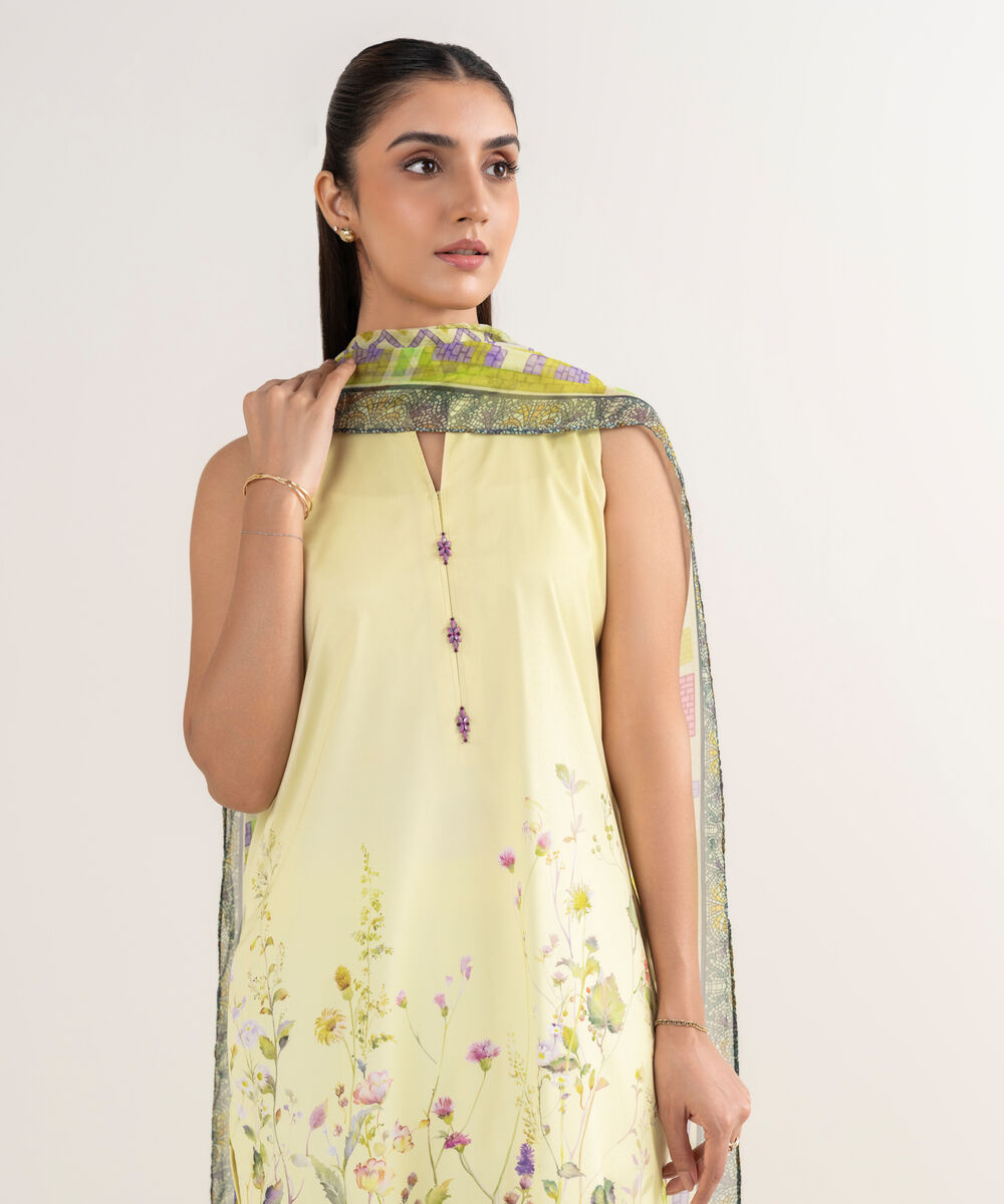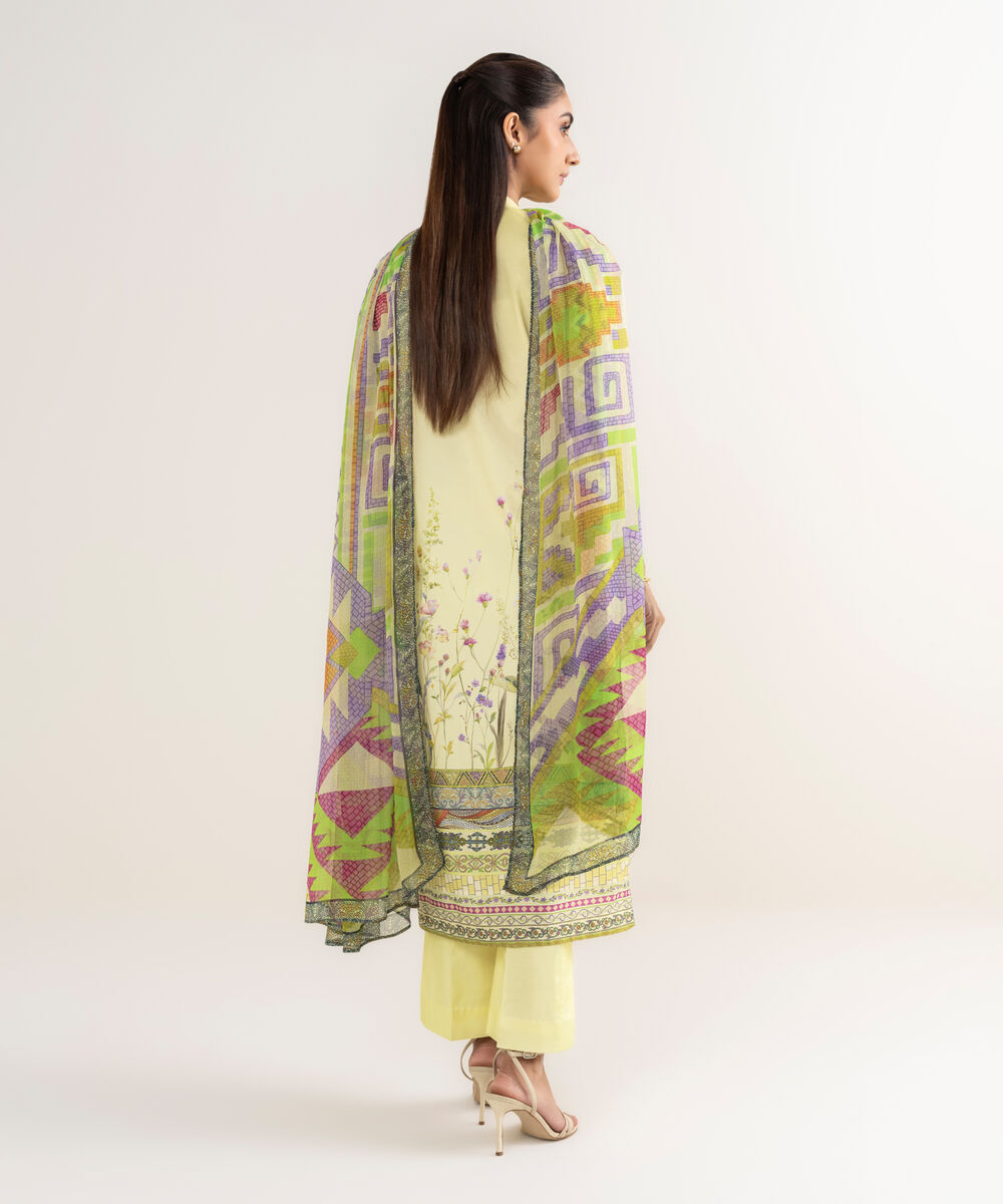 Make a statement with our three-piece printed pastel yellow ensemble featuring a lawn shirt paired with a blended chiffon dupatta and cotton trousers.