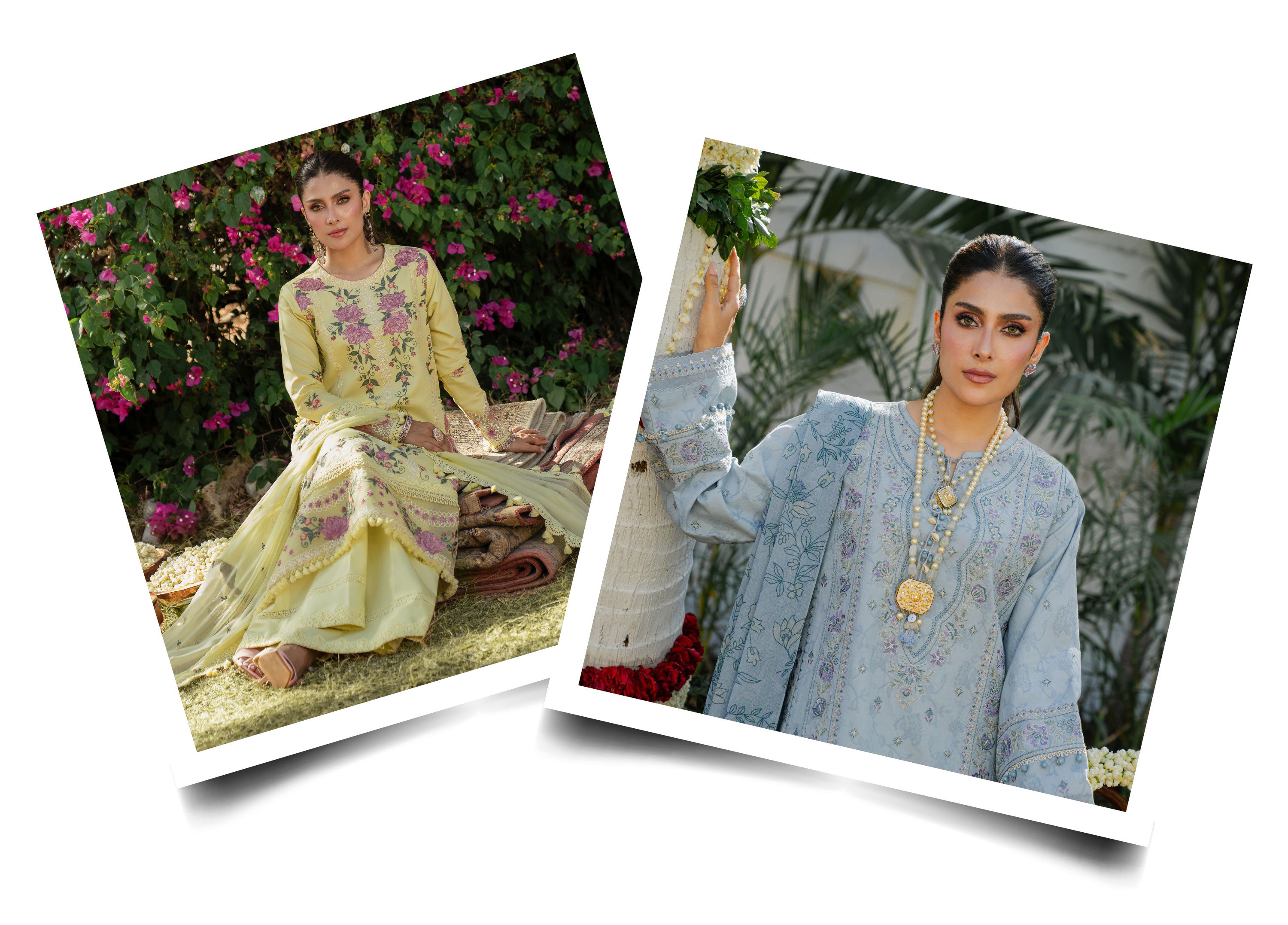 Delicate paisleys, buoyant florals, and gleaming tilla sequins effortlessly transition from bustling dining rooms to sunlit lunches. Through Ayeza, we see a reflection of so many women: resilient, feminine, and ever-capable, managing it all with poise.